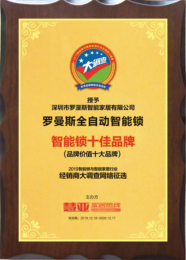 ? ? ? 近日,由慧亞家居熱線(xiàn)主辦的2019智能鎖與智能家居經(jīng)銷(xiāo)商大調查優(yōu)秀品牌網(wǎng)絡(luò )征選結果公布。羅曼斯在150個(gè)參選品牌中脫穎而出,榮獲智能鎖十大品牌(品牌價(jià)值十大品牌)獎項。