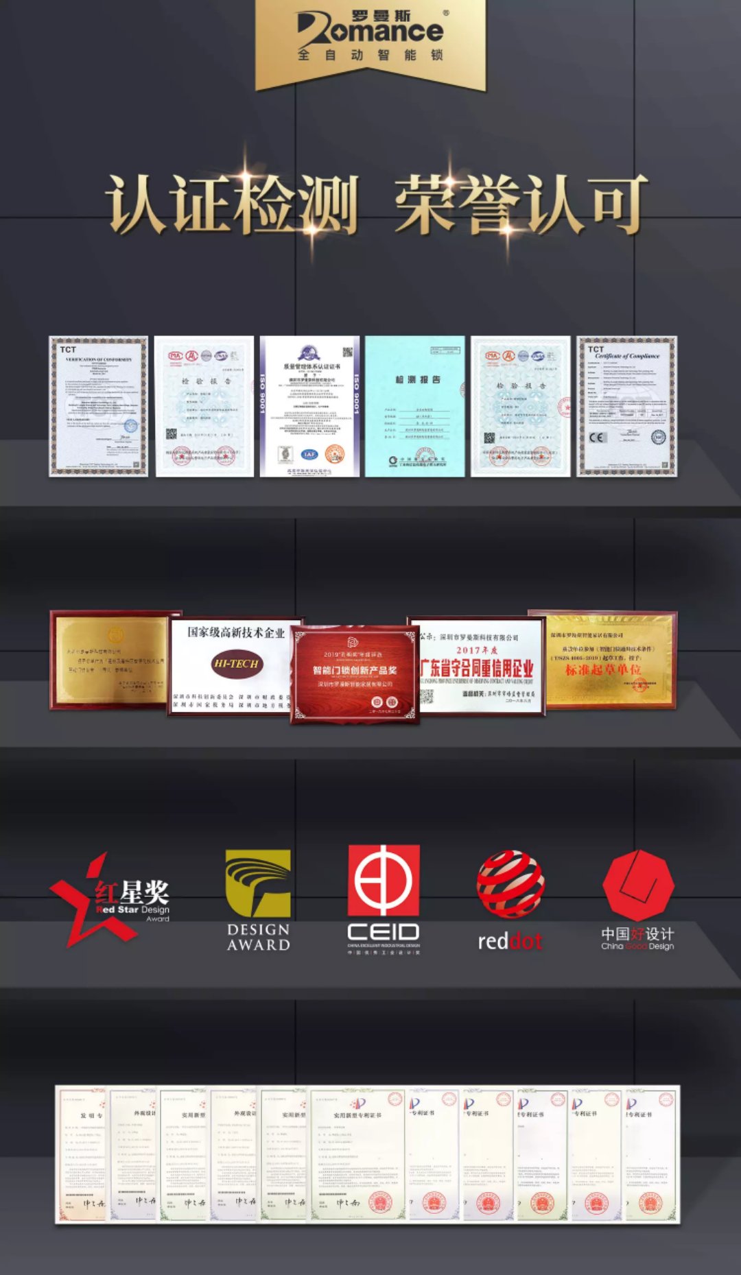 ? ? ? 產(chǎn)品品質(zhì)是羅曼斯的品牌基石,作為行業(yè)尖端的代表性產(chǎn)品,羅曼斯堅守國際及行業(yè)標準專(zhuān)注每一處的細節品質(zhì),羅曼斯全自動(dòng)智能鎖先后經(jīng)過(guò)12萬(wàn)次開(kāi)關(guān)測試、30萬(wàn)次鎖芯上鎖測試,限制6類(lèi)有害物質(zhì)、紫外線(xiàn)測試、鹽霧測試;產(chǎn)品更是經(jīng)過(guò)國家權威機構檢驗檢測,確保每一把鎖都承載羅曼斯對您智能生活夢(mèng)想的追求。