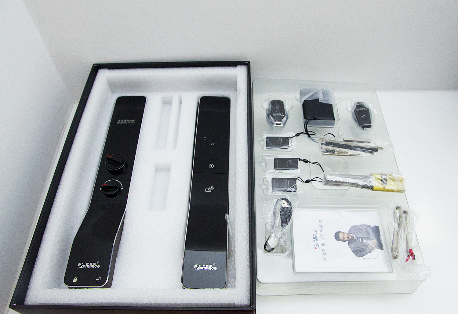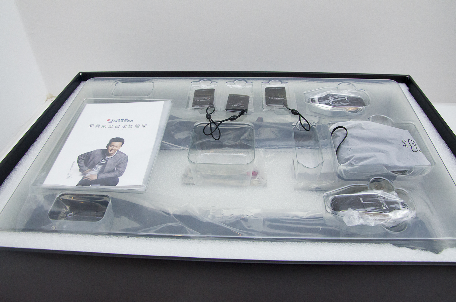 下面我們來(lái)看一下DD5的全體成員:前后鎖板各一個(gè)、鎖芯、前后鎖板連接線(xiàn)1條、2把鑰匙、2個(gè)遙控器、3張IC卡、充電寶1個(gè)、充電線(xiàn)1個(gè)、三包服務(wù)1份、螺絲配件包1份等。零件基本做工細致,大概是經(jīng)過(guò)表面處理,用手摸上去,觸感光滑,很有質(zhì)感。