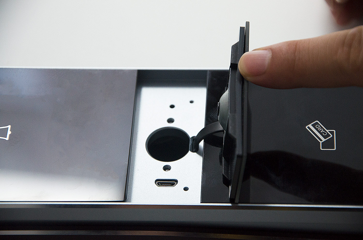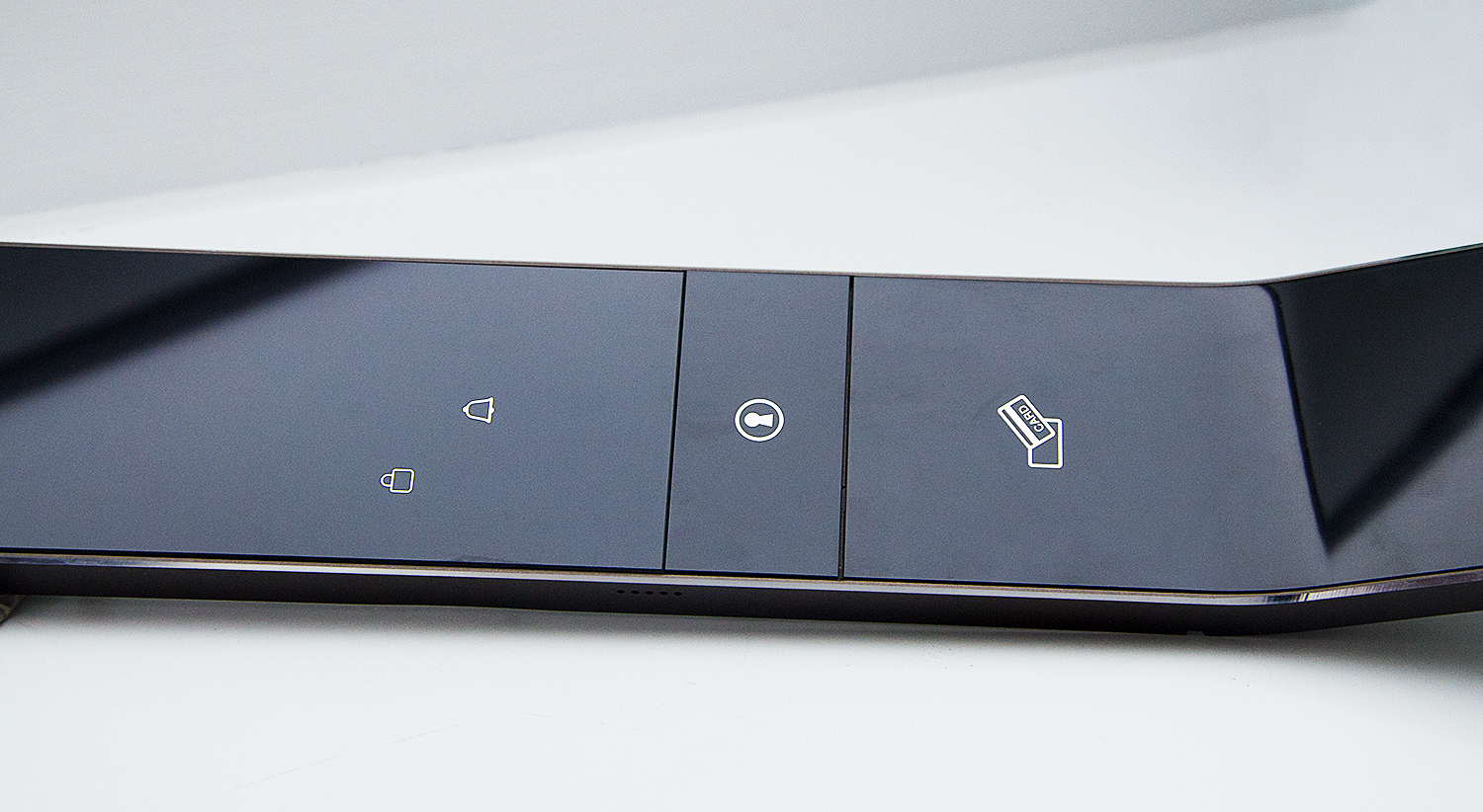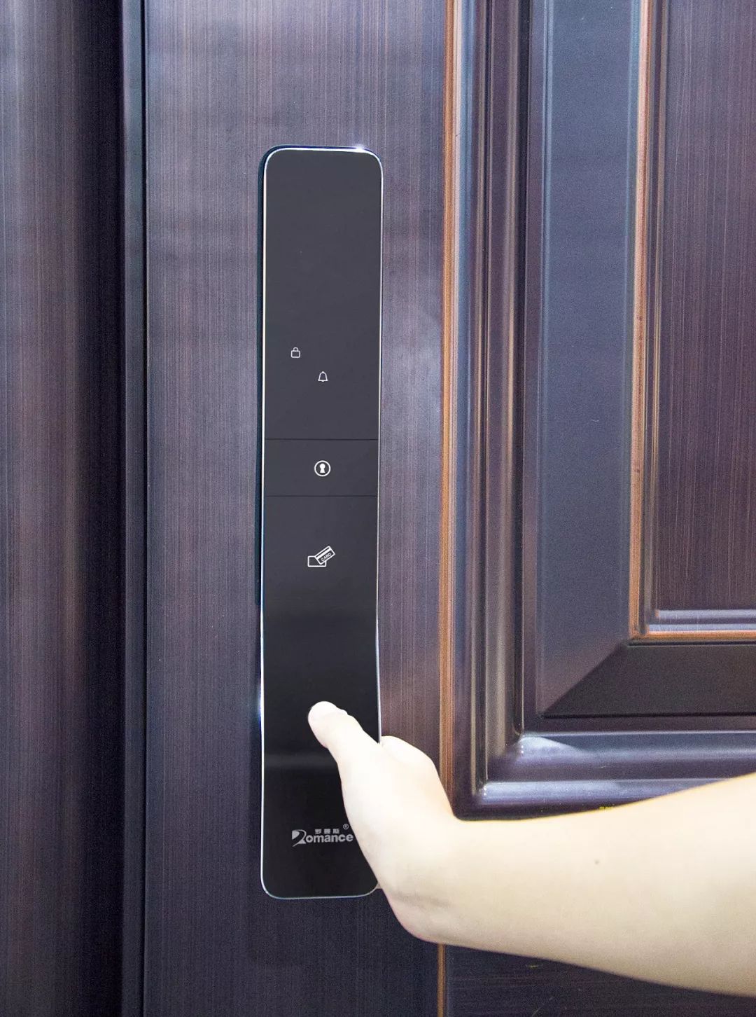 ? ? ? ?前鎖板(右)上分別有密碼識別區、門(mén)鈴按鍵、IC卡感應區、指紋感應區、logo。