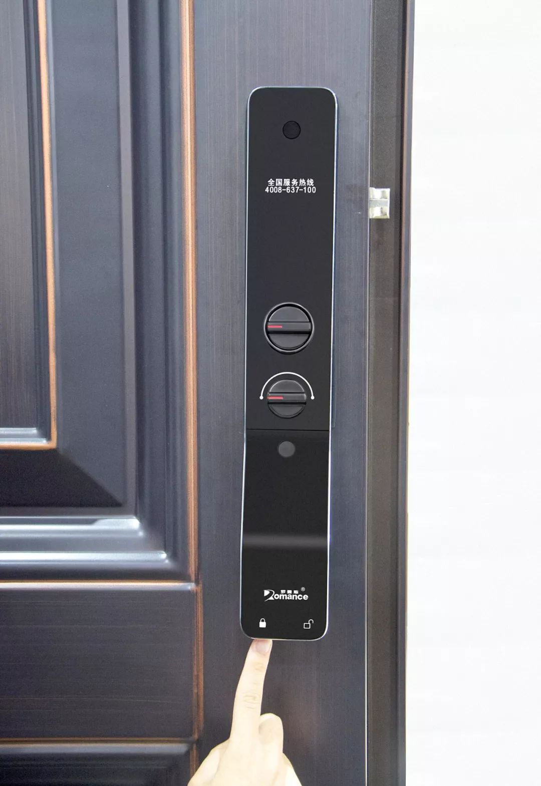 ? ? ? ?后鎖板(左)上分別有全國400售后電話(huà)、室內應急旋鈕、內保險旋鈕、一鍵開(kāi)上鎖。